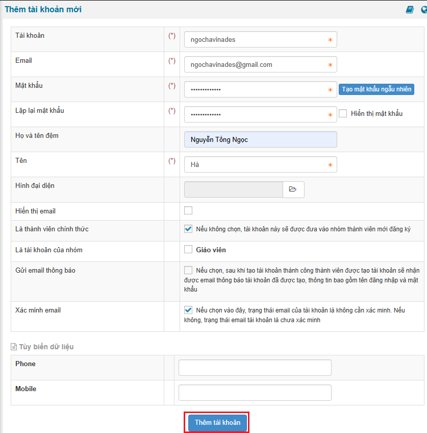 2, Điền đầy đủ thông tin tài khoản và bấm vào Thêm tài khoản